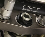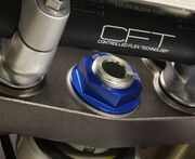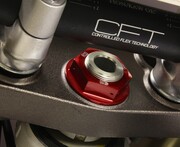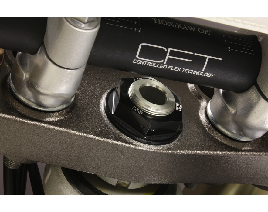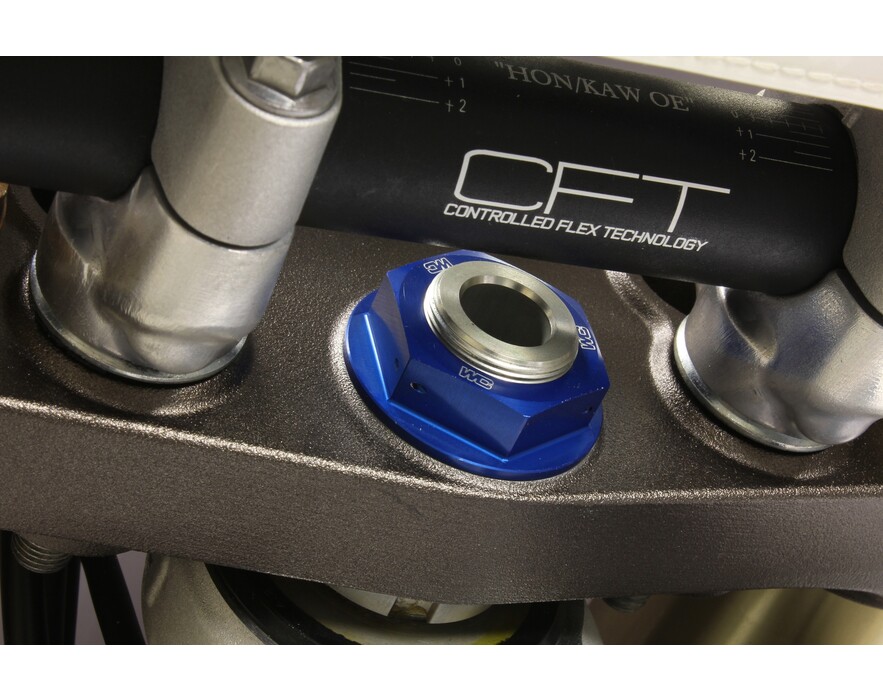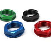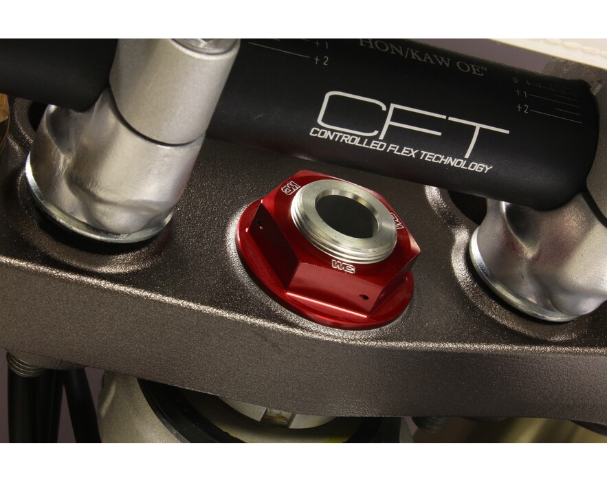 Our Steering Stem Nut eliminates the issue of a twisted fuel vent tube forever. A CNC machined hole in the center of the steering stem nut allows you to relocate the end of the vent tube from the frame into the steering stem nut for convenient, kink free fill ups. Built from durable 6061-T6 aluminum for weight savings and includes pre-drilled safety wire holes for added confidence over the stock nut. CNC engraved logos and brilliant anodized finish in Blue, Red, Orange or Black create that Factory look.