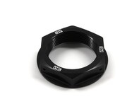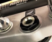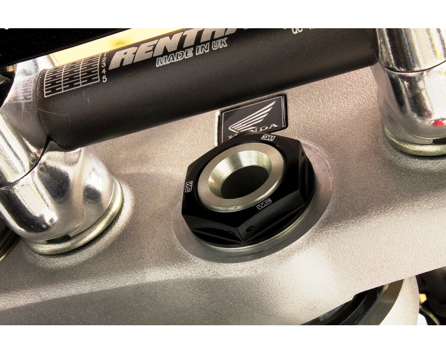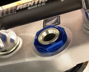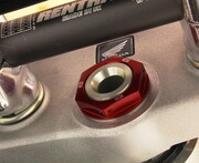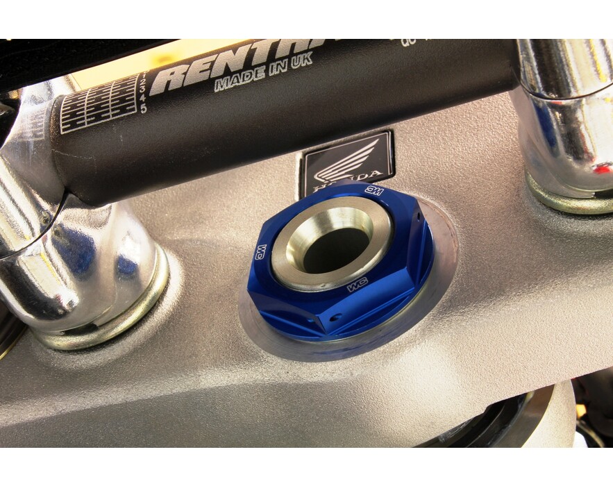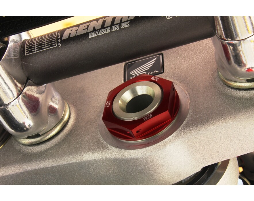Our Steering Stem Nut eliminates the issue of a twisted fuel vent tube forever. A CNC machined hole in the center of the steering stem nut allows you to relocate the end of the vent tube from the frame into the steering stem nut for convenient, kink free fill ups. Built from durable 6061-T6 aluminum for weight savings and includes pre-drilled safety wire holes for added confidence over the stock nut. CNC engraved logos and brilliant anodized finish in Blue, Red, Orange or Black create that Factory look.